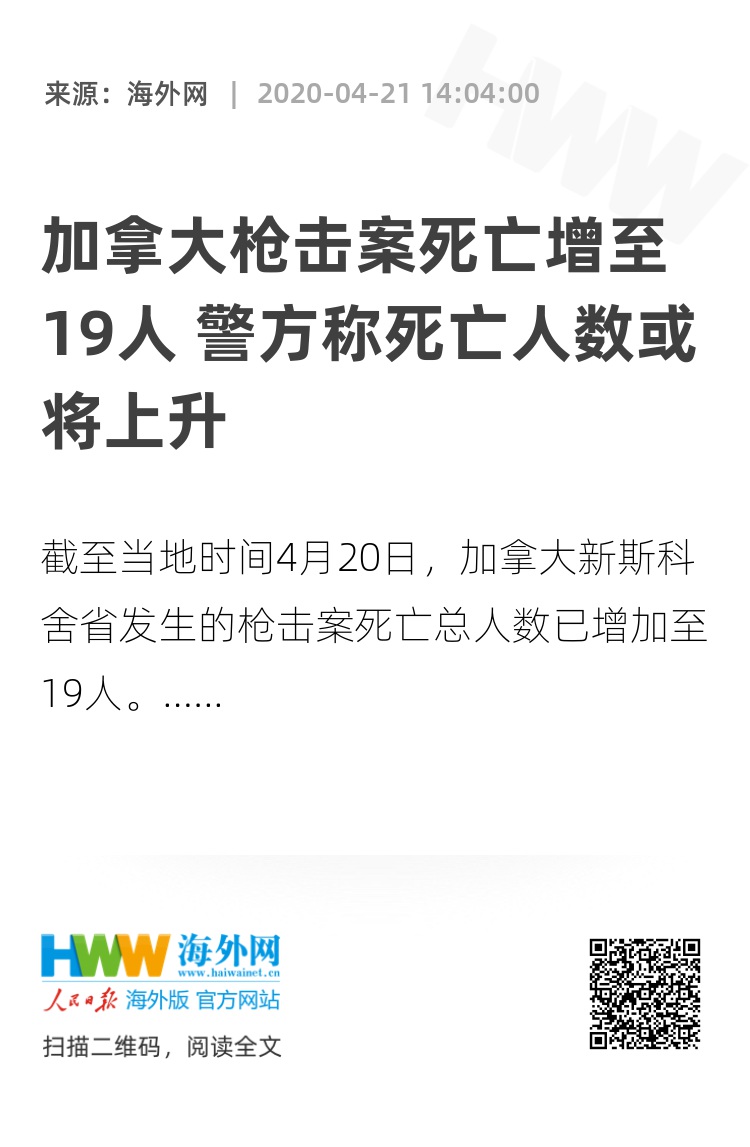【海外网4月21日编译报道】截至当地时间4月20日,加拿大新斯科舍省发生的枪击案死亡总人数已增加至19人。但警方表示,死亡人数可能还会增加。