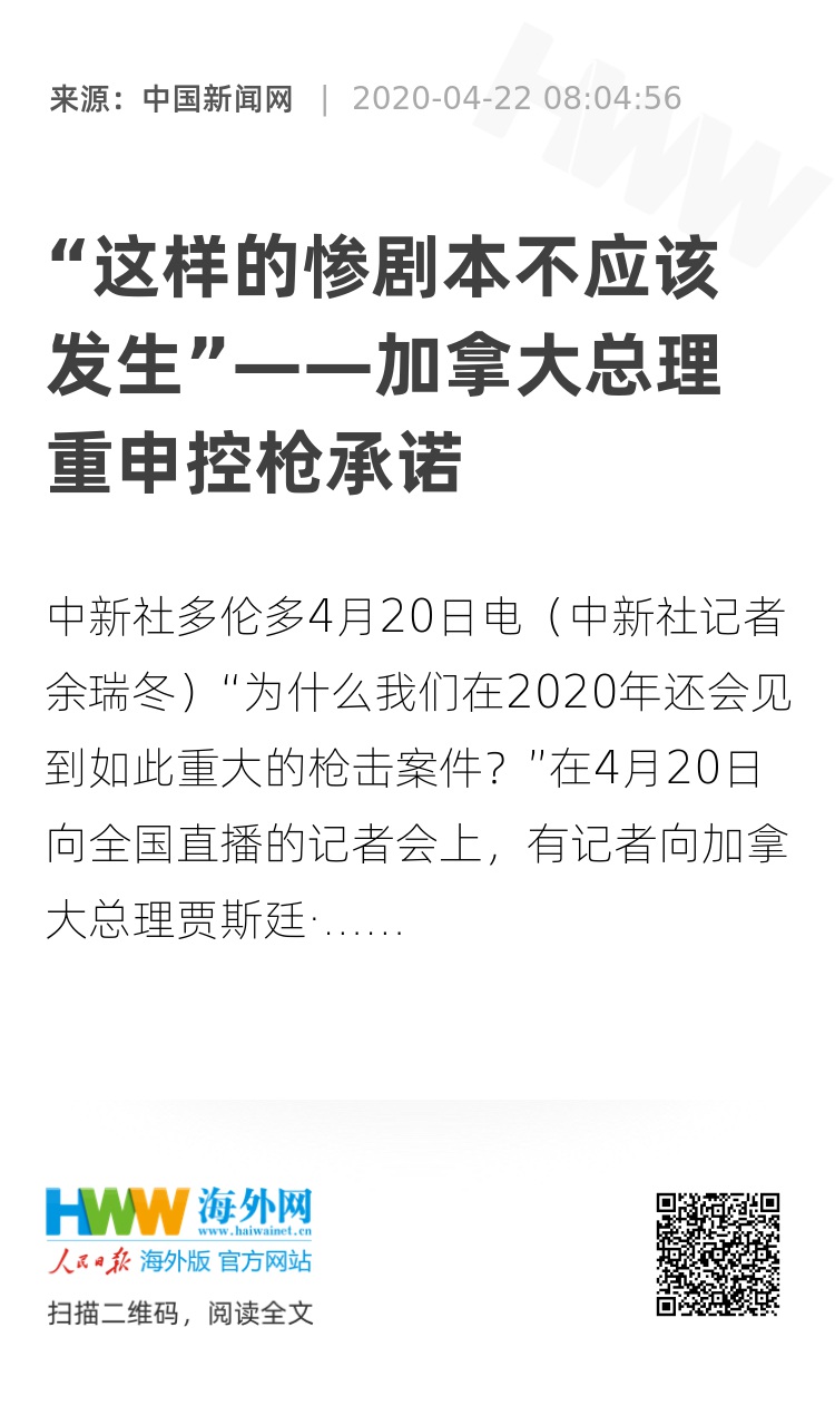 中新社多伦多4月20日电(中新社记者 余瑞冬)“为什么我们在2020年还会见到如此重大的枪击案件?”在4月20日向全国直播的记者会上,有记者向加拿大总理贾斯廷·特鲁多提问。