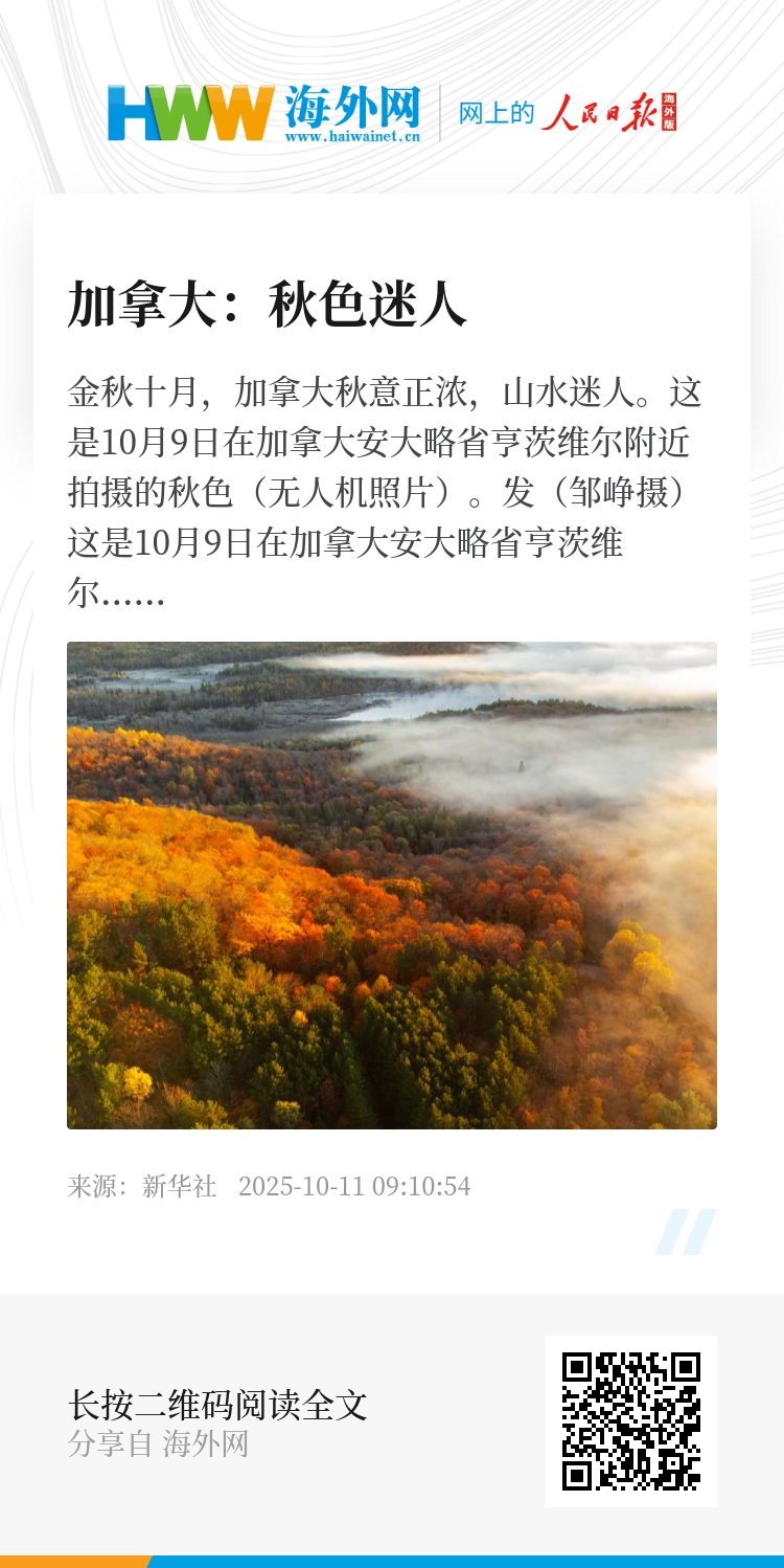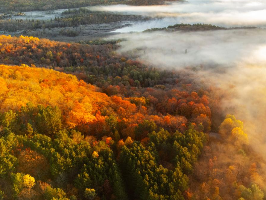 这是10月9日在加拿大安大略省亨茨维尔附近拍摄的秋色(无人机照片)。新华社发(邹峥摄)