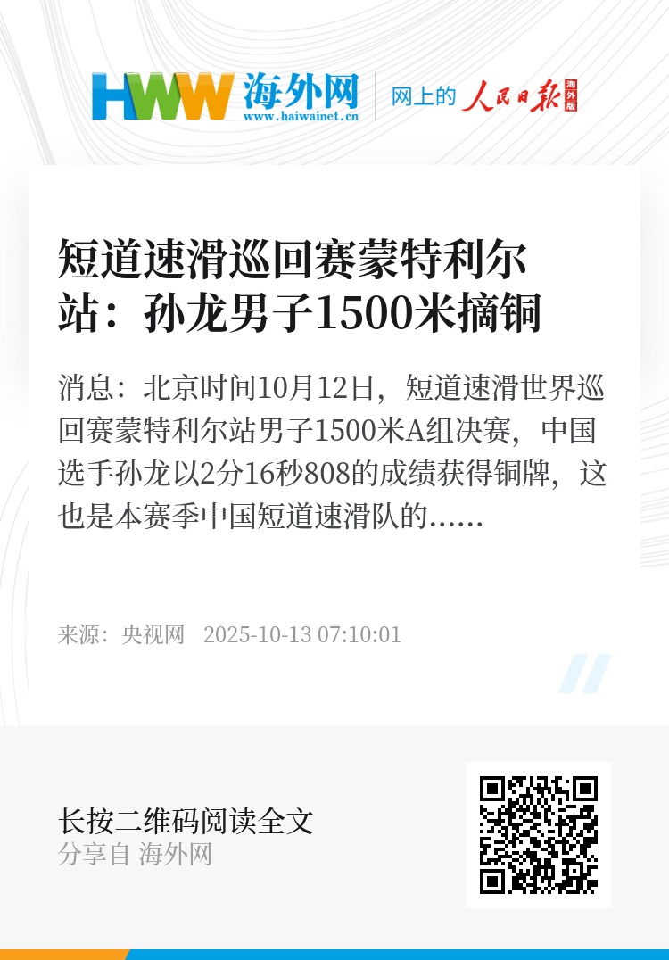 央视网消息:北京时间10月12日,短道速滑世界巡回赛蒙特利尔站男子1500米A组决赛,中国选手孙龙以2分16秒808的成绩获得铜牌,这也是本赛季中国短道速滑队的首枚奖牌。另一名中国选手刘少昂排名第六。