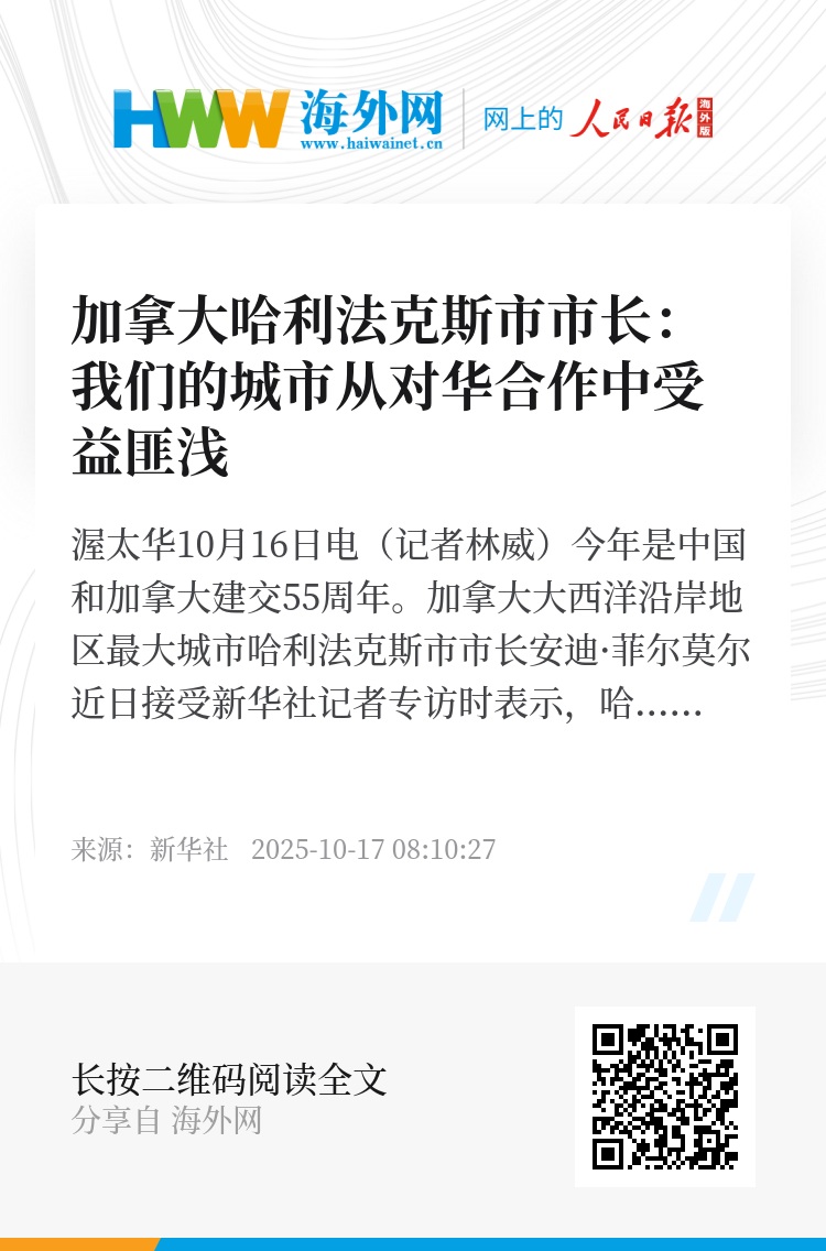 新华社渥太华10月16日电(记者林威)今年是中国和加拿大建交55周年。加拿大大西洋沿岸地区最大城市哈利法克斯市市长安迪·菲尔莫尔近日接受新华社记者专访时表示,哈利法克斯珍视与中方的友好关系,期待在经贸、科教、人文等领域进一步深化合作,为加中关系发展注入新动力。