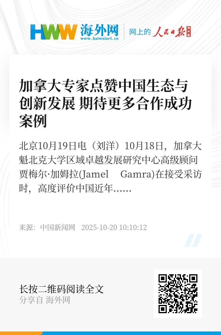 中新网北京10月19日电(刘洋)10月18日,加拿大魁北克大学区域卓越发展研究中心高级顾问贾梅尔·加姆拉(Jamel Gamra)在接受采访时,高度评价中国近年来在生态建设、技术创新领域的跨越式发展,期待更多中国力量加入共创全球可持续发展新路径。