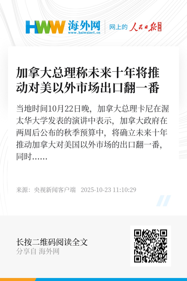 当地时间10月22日晚,加拿大总理卡尼在渥太华大学发表的演讲中表示,加拿大政府在两周后公布的秋季预算中,将确立未来十年推动加拿大对美国以外市场的出口翻一番,同时调整加拿大移民政策的重点,并增加对重大项目的投资。