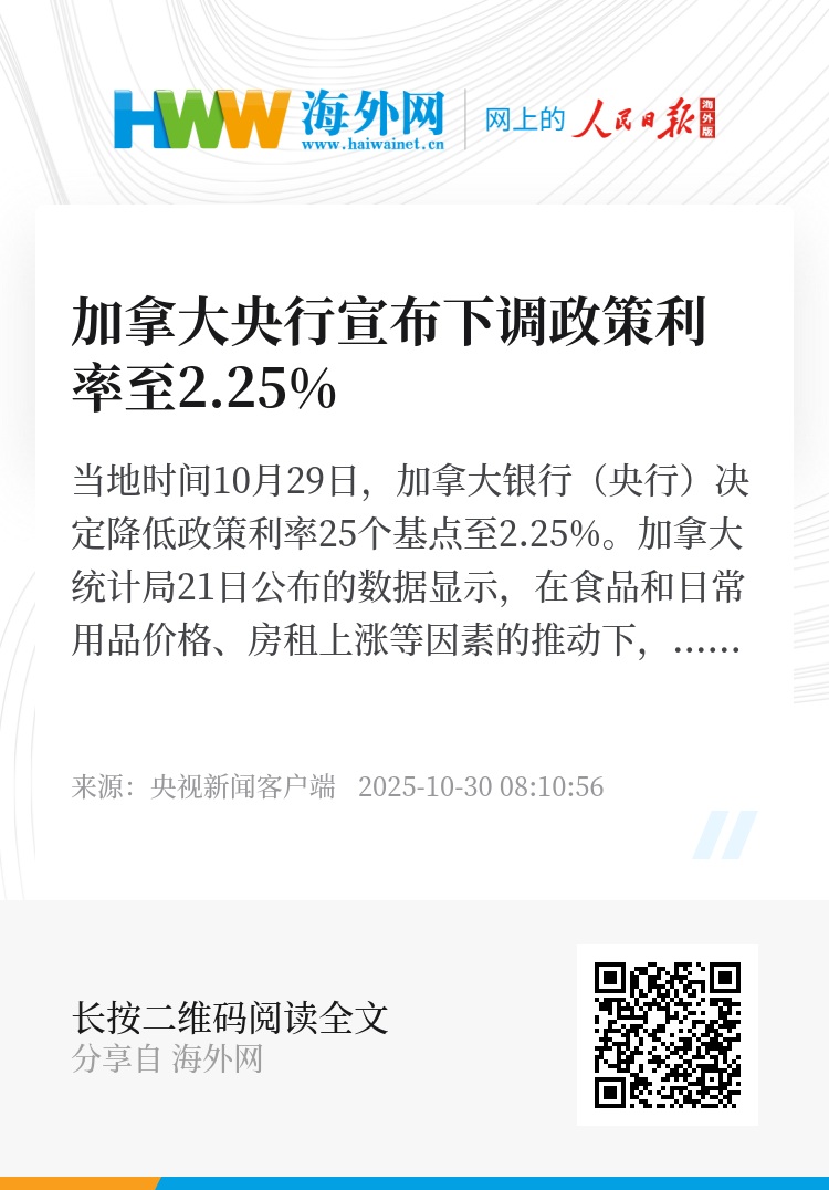 当地时间10月29日,加拿大银行(央行)决定降低政策利率25个基点至2.25%。