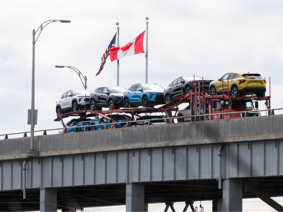 4月9日,在加拿大安大略省尼亚加拉瀑布市加美边境地带,一辆满载的汽车运输车通过刘易斯顿-昆斯顿桥开往加拿大。新华社发(邹峥摄)