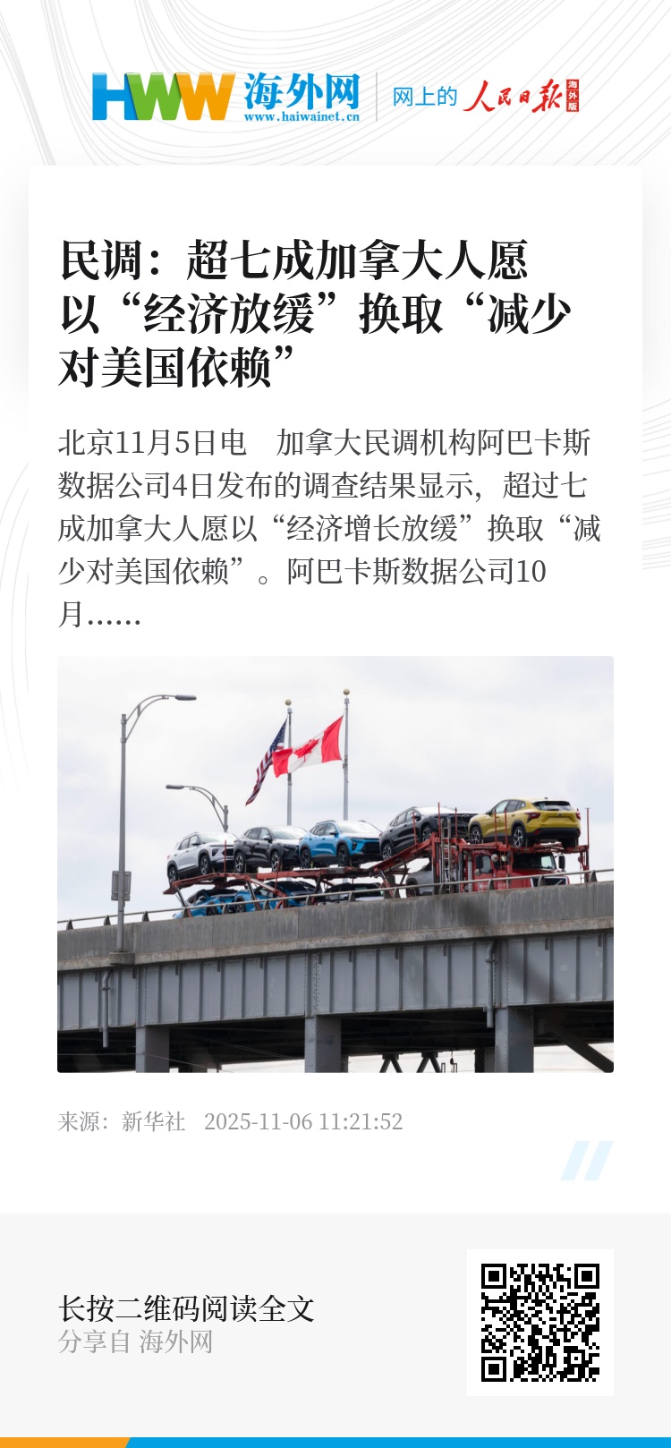 新华社北京11月5日电 加拿大民调机构阿巴卡斯数据公司4日发布的调查结果显示,超过七成加拿大人愿以“经济增长放缓”换取“减少对美国依赖”。