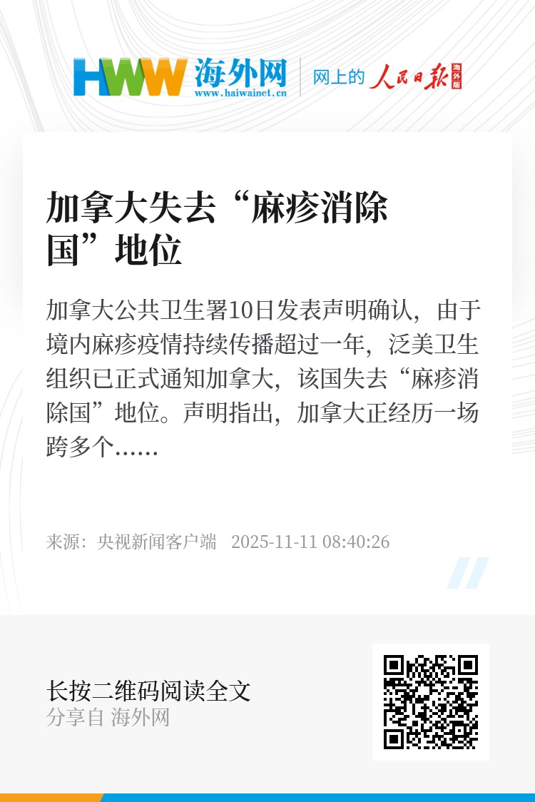 加拿大公共卫生署10日发表声明确认,由于境内麻疹疫情持续传播超过一年,泛美卫生组织已正式通知加拿大,该国失去“麻疹消除国”地位。