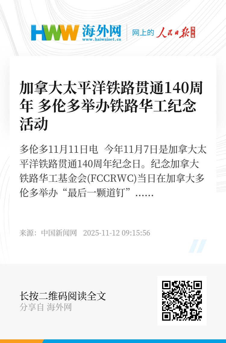 据加官方资料,19世纪80年代,约1.7万名华工参与了加拿大太平洋铁路的修筑,作出巨大贡献,数千人付出生命。目前,多伦多、埃德蒙顿、渥太华等城市已宣布将11月7日确立为铁路华工纪念日。纪念加拿大华人铁路工人基金会等有关华人社团亦正推动在全加设立该纪念日。