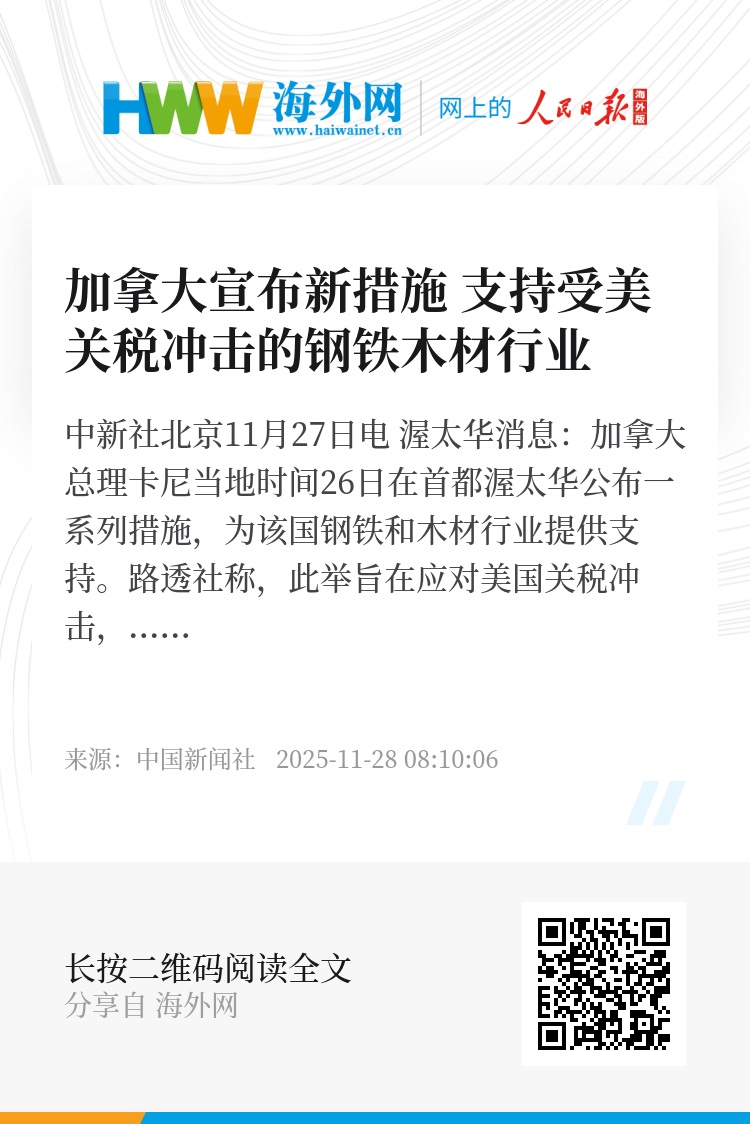 中新社北京11月27日电 渥太华消息:加拿大总理卡尼当地时间26日在首都渥太华公布一系列措施,为该国钢铁和木材行业提供支持。路透社称,此举旨在应对美国关税冲击,并强化加国内市场。