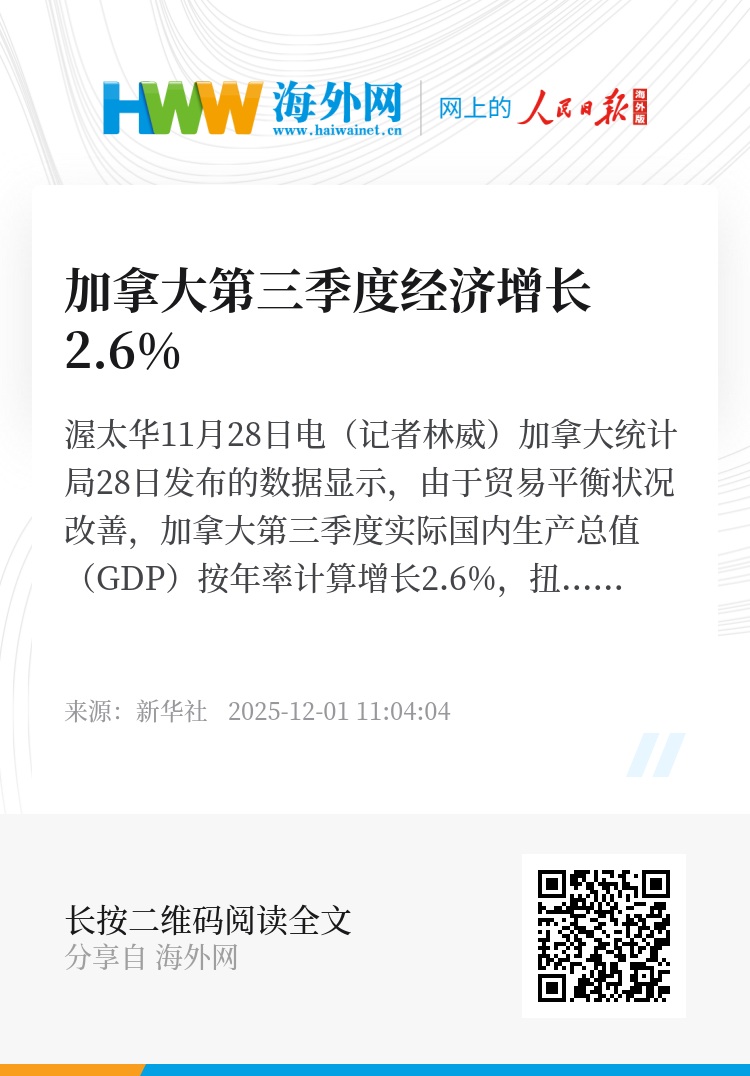 新华社渥太华11月28日电(记者林威)加拿大统计局28日发布的数据显示,由于贸易平衡状况改善,加拿大第三季度实际国内生产总值(GDP)按年率计算增长2.6%,扭转了第二季度的萎缩态势。
