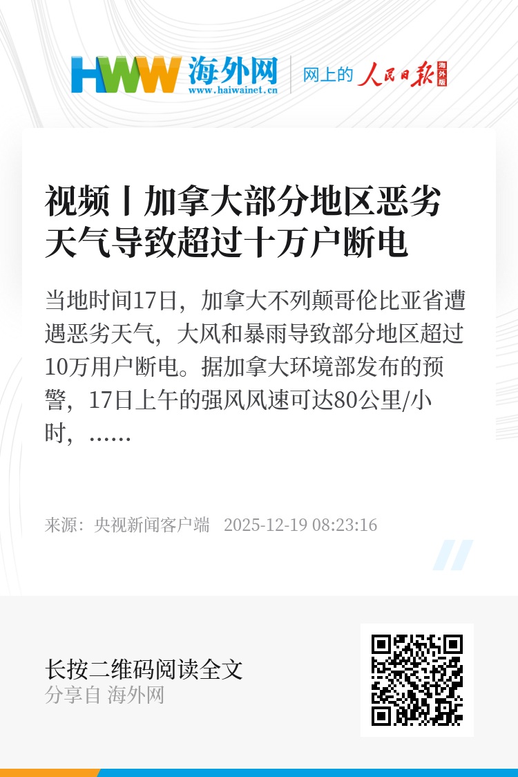 当地时间17日,加拿大不列颠哥伦比亚省遭遇恶劣天气,大风和暴雨导致部分地区超过10万用户断电。据加拿大环境部发布的预警,17日上午的强风风速可达80公里/小时,部分地区的风速甚至可能更高。