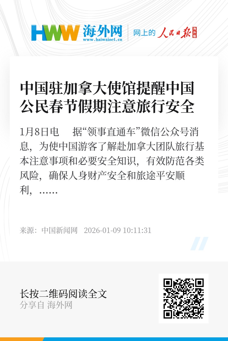 中新网1月8日电 据“领事直通车”微信公众号消息,为使中国游客了解赴加拿大团队旅行基本注意事项和必要安全知识,有效防范各类风险,确保人身财产安全和旅途平安顺利,中国驻加拿大使馆特别提醒注意以下事项: