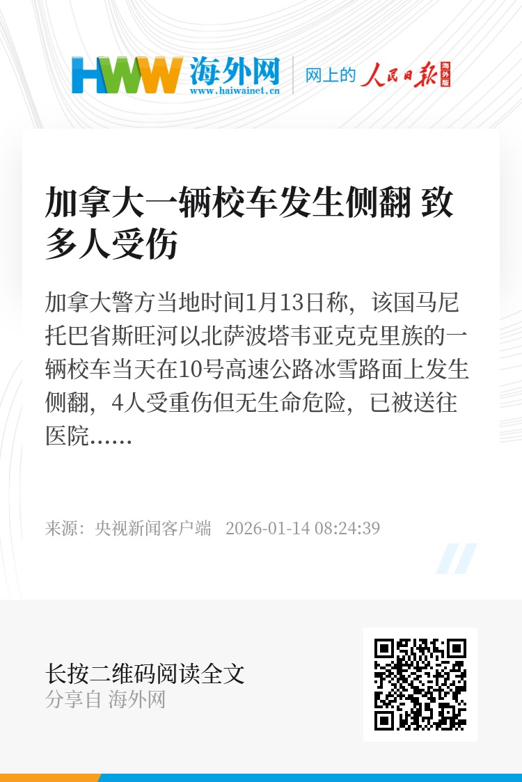 加拿大警方当地时间1月13日称,该国马尼托巴省斯旺河以北萨波塔韦亚克克里族的一辆校车当天在10号高速公路冰雪路面上发生侧翻,4人受重伤但无生命危险,已被送往医院。另有多名学生在现场接受治疗后也被送往医院。