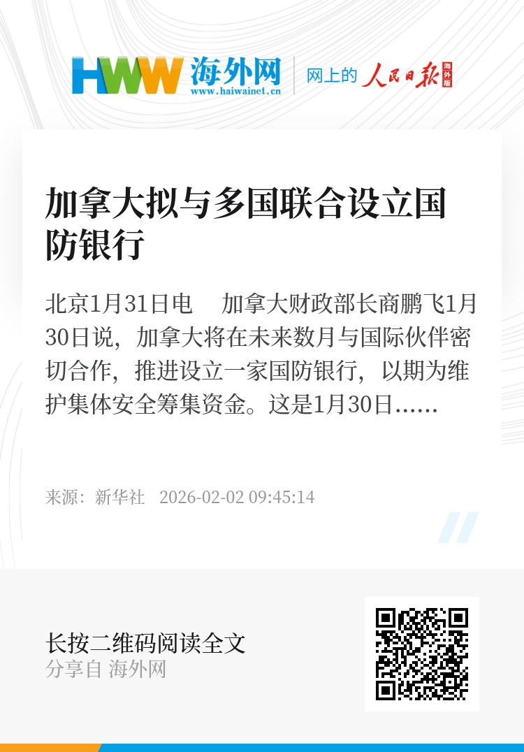 新华社北京1月31日电 加拿大财政部长商鹏飞1月30日说,加拿大将在未来数月与国际伙伴密切合作,推进设立一家国防银行,以期为维护集体安全筹集资金。