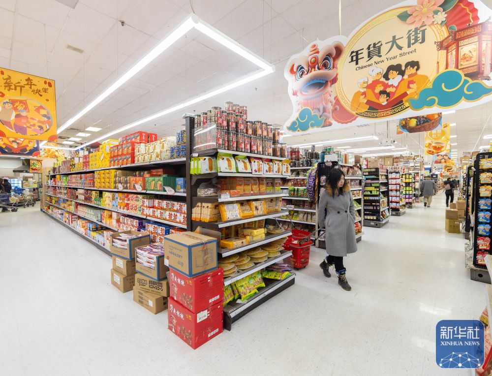2月6日,顾客在加拿大安大略省奥克维尔一处布置着春节装饰的超市购物。