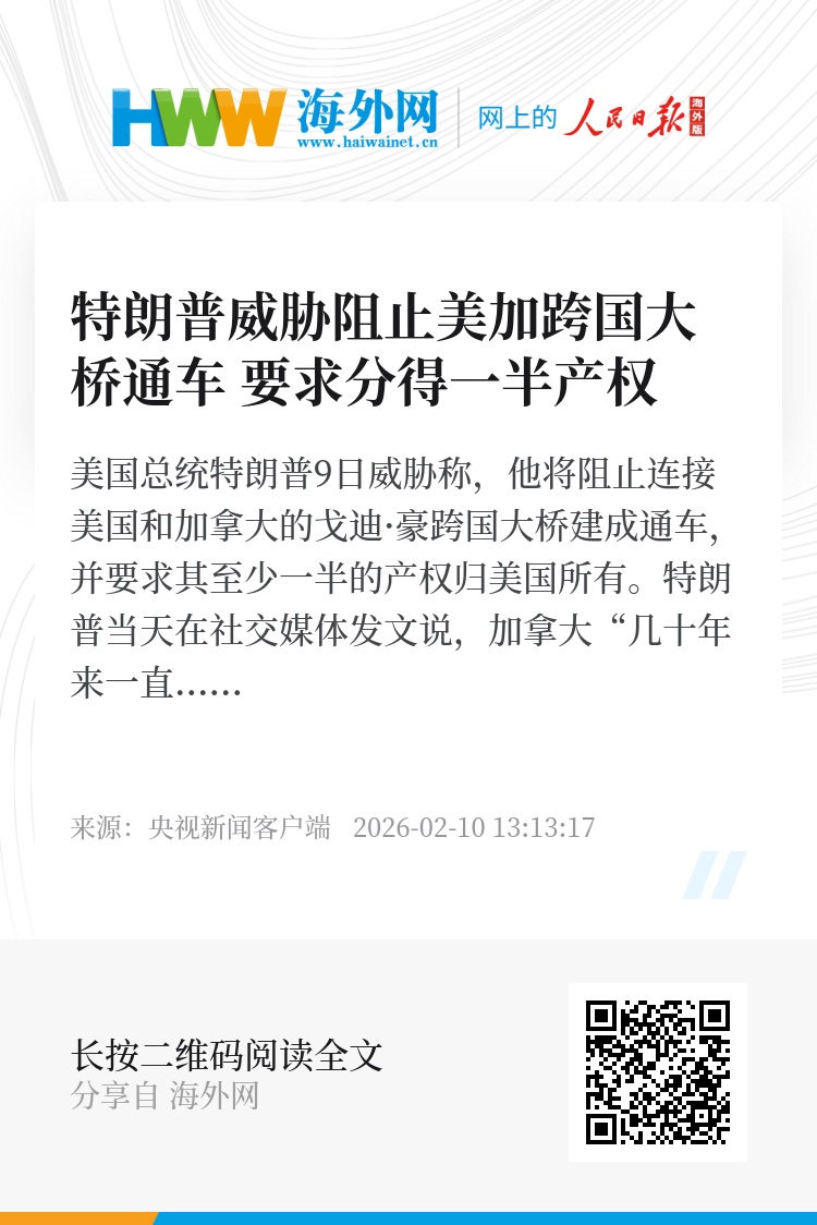 美国总统特朗普9日威胁称,他将阻止连接美国和加拿大的戈迪·豪跨国大桥建成通车,并要求其至少一半的产权归美国所有。