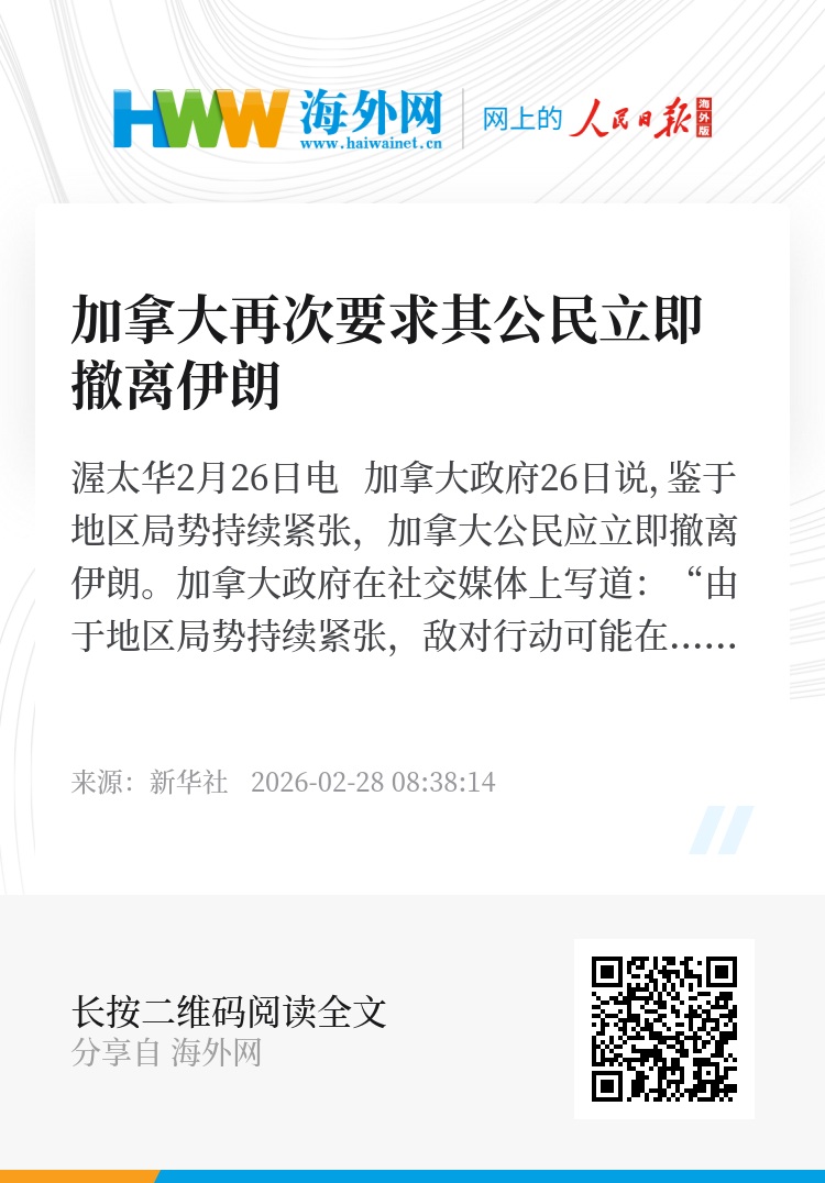 新华社渥太华2月26日电 加拿大政府26日说,鉴于地区局势持续紧张,加拿大公民应立即撤离伊朗。