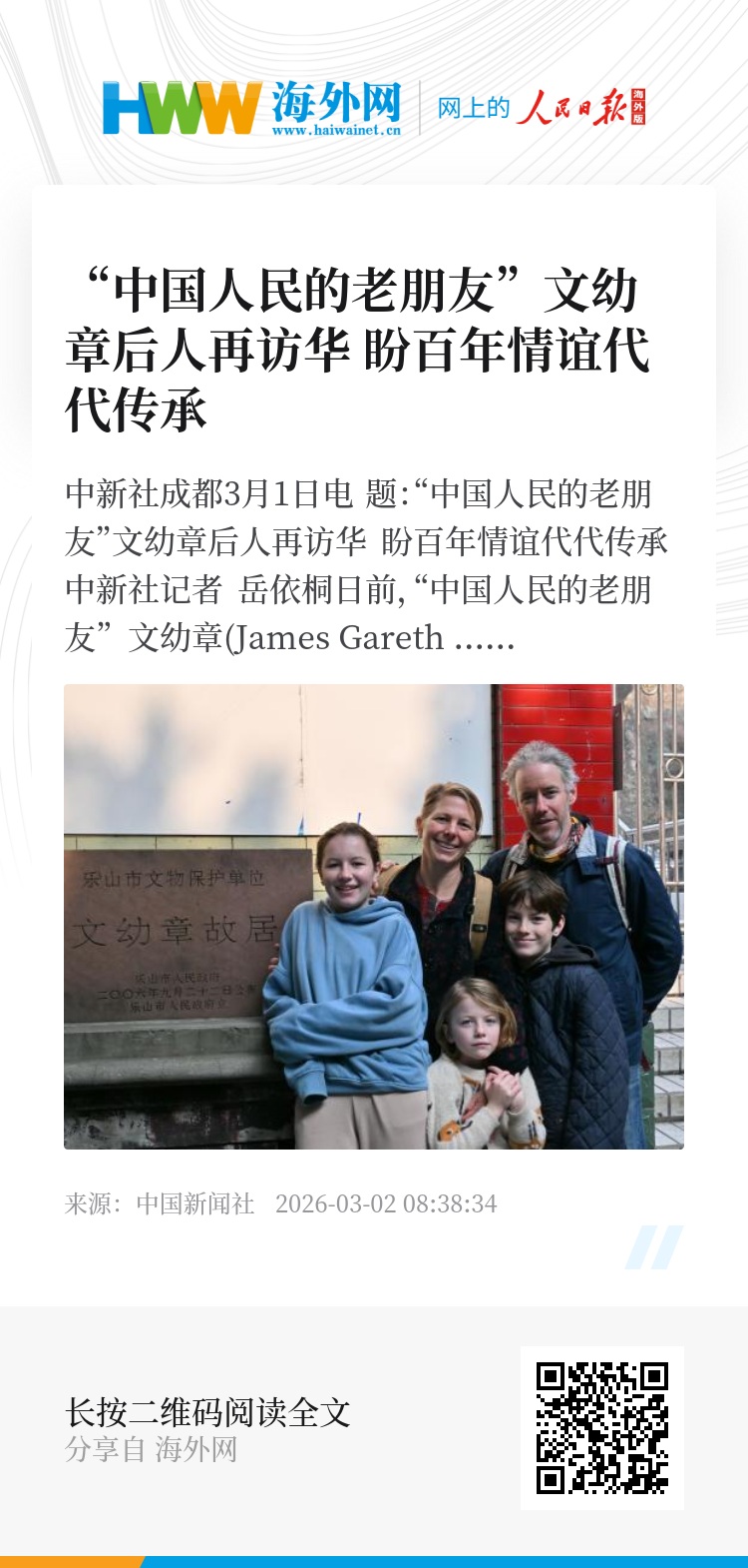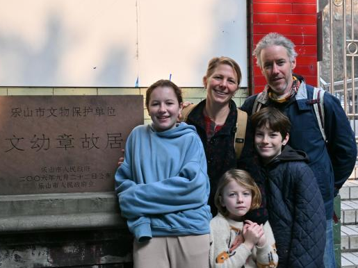 采访告一段落之际,劳拉向中新社记者展示她与丈夫、儿女在乐山市文幼章故居前拍摄的一张照片。“这是曾祖父出生的地方,是我们家族与中国缘分的起点,这份情谊直至今日,对我们家族而言依旧意义非凡。能站在这里,将这份缘分的起点与当下联结起来,这种感觉格外美好。”