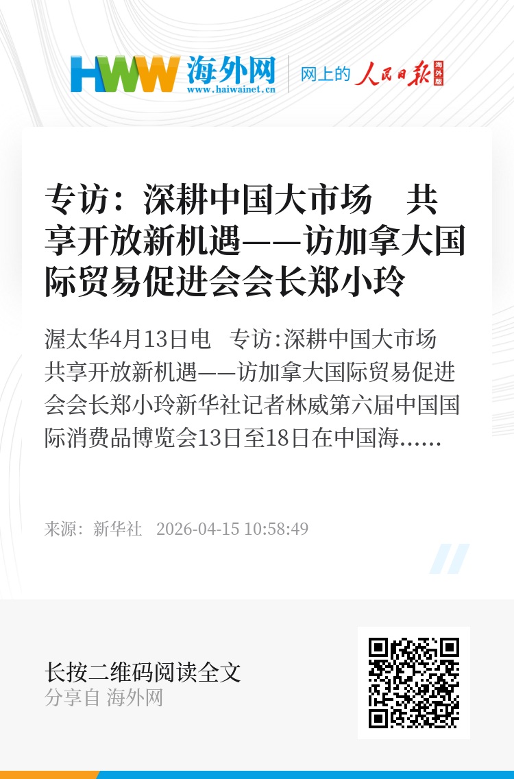 新华社渥太华4月13日电 专访:深耕中国大市场 共享开放新机遇——访加拿大国际贸易促进会会长郑小玲