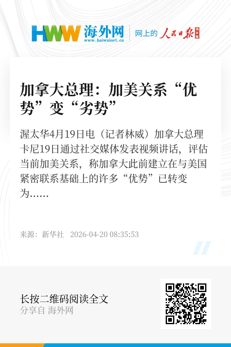 新华社渥太华4月19日电(记者林威)加拿大总理卡尼19日通过社交媒体发表视频讲话,评估当前加美关系,称加拿大此前建立在与美国紧密联系基础上的许多“优势”已转变为必须纠正的“劣势”,并呼吁通过对外贸易多样化应对当前挑战。