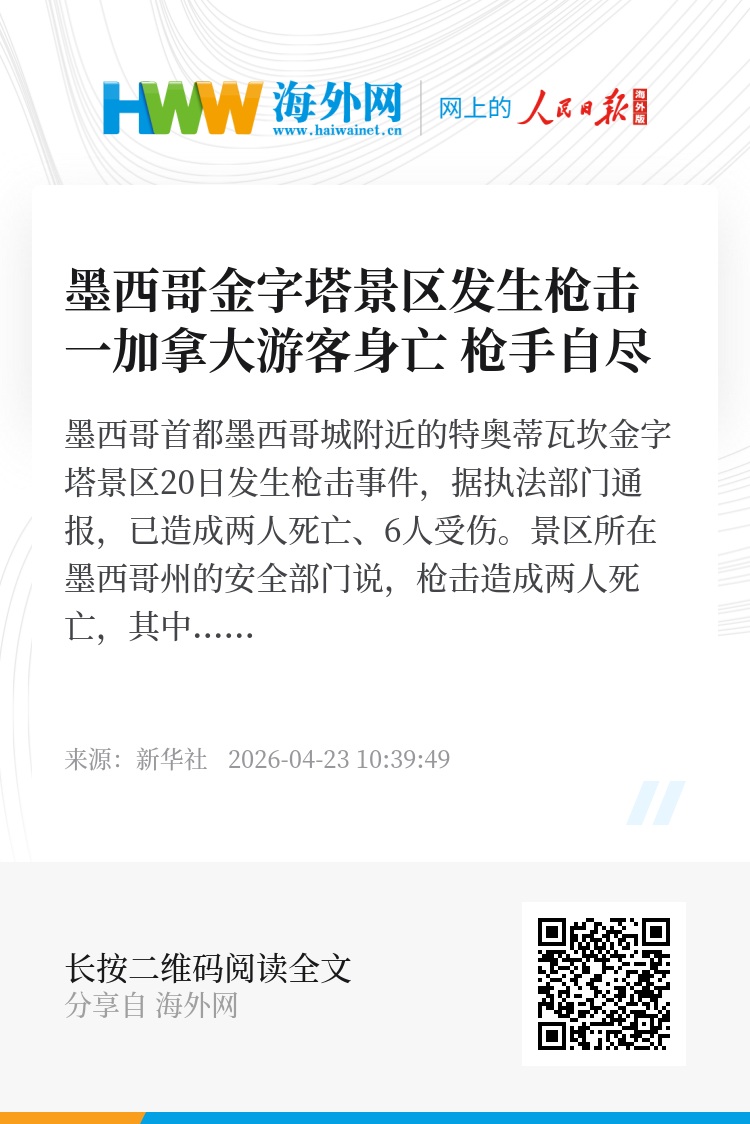墨西哥首都墨西哥城附近的特奥蒂瓦坎金字塔景区20日发生枪击事件,据执法部门通报,已造成两人死亡、6人受伤。